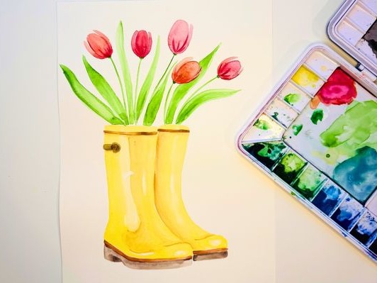 Join me for a relaxed and creative evening in the studio as we paint a cheerful spring tulip scene (in rain boots 🌷).